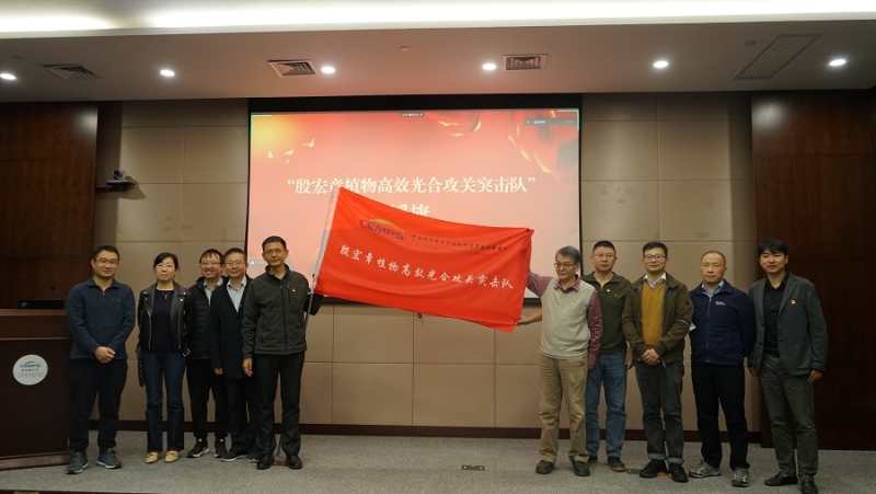 中心党委书记、副主任郭金华为“殷宏章植物高效光合攻关突击队”授旗。张鹏、朱新广、郭房庆、刘宏涛、凌祺桦、王鹏、叶瑞强、范敏锐等8名研究员作为突击队成员代表上台领旗。