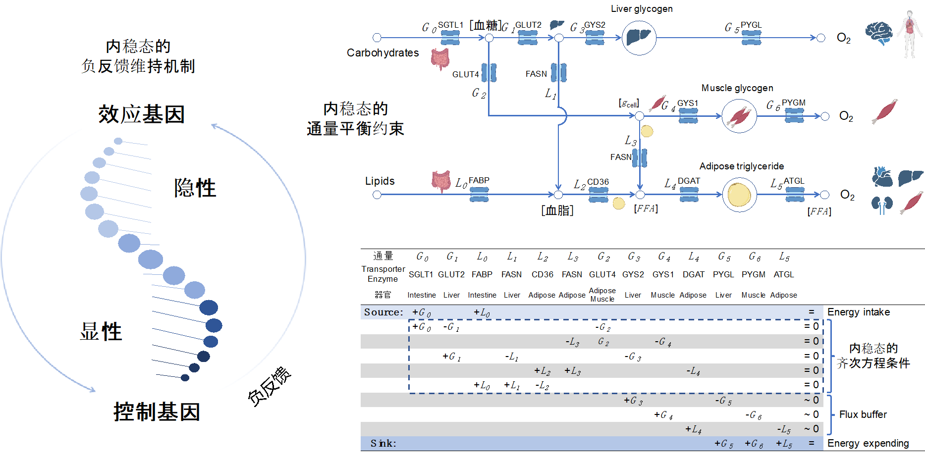 通过这一新构造的覆盖人体49个组织16,448个常染色体基因的剂量敏感性图谱,研究团队发现基因的剂量约束来源于维持机体内稳态的负反馈机制。生物控制系统和所有控制系统的原理一致,效应器(酶/转运体/细胞因子/受体)是剂量耐受的(对应基因突变是隐性遗传),而控制器(转录因子/激酶/离子通道/转录翻译机器)是剂量敏感的(对应基因突变是显性遗传)。基于设定点(set-point)的负反馈机制(即控制器根据系统离设定点的差来决定效应器的调节方向),是通量平衡方程(物质守恒和能量守恒)的通用解法,也是生命体控制系统稳态维持的普遍机制。其中,通量的大小(物质流、能量流)是由效应基因直接调节的,而负反馈的设定点(如血糖、体温、血压等)是由控制基因所决定的。