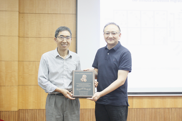 管坤良从Hippo信号通路的发现讲起,介绍他的研究团队发现了Hippo通路在热诱导的细胞应激反应中发挥重要的调控作用并揭示其中具体信号转导机制的研究工作;团队还发现Hippo通路中关键转录共激活因子YAP在小细胞肺癌发生发展中显著下调,揭示YAP的下调在促进小细胞肺癌转移中的关键功能以及其中详细的信号通路调控机制。报告不仅展示了高水平的研究成果,管坤良风趣幽默的讲解也让听众印象深刻。讲座结束后,所务委员陈剑峰为管坤良颁发了王应睐讲座荣誉证书。