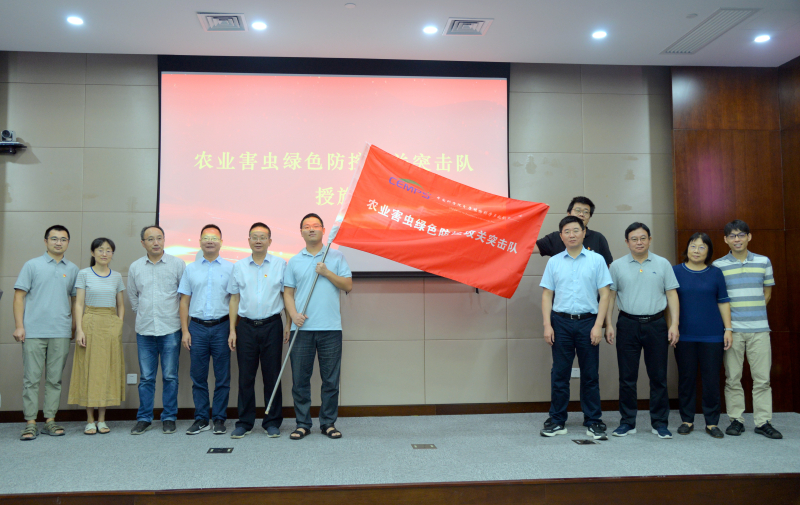 郭金华与中心所务委员、党委委员、植物性状形成与塑造重点实验室主任巫永睿研究员共同为“农业害虫绿色防控攻关突击队”授旗,王四宝、王成树、毛颖波、李建彩、许军、凌尔军、苗雪霞、黄伟杰、詹帅等9名研究员作为突击队成员代表上台领受队旗。