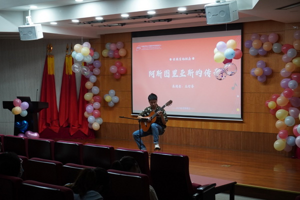 歌曲节目之外,古典吉他的琴声也为晚会增添了别样的迷人色彩,王行睿同学的吉他独奏《阿斯图里亚斯的传奇》热烈与沉静结合,豪迈与婉转相济,向大家展现了这首《荷马史诗》般的吉他名曲的魅力,让全场观众都沉浸在悠扬的琴声之中。