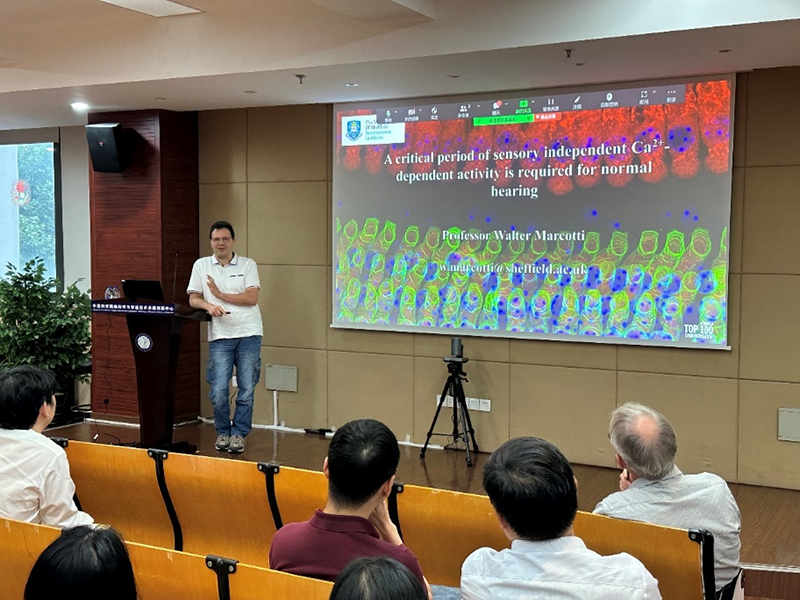 此次听觉研讨会从发育生物学和电生生理学角度,系统讨论了外周听觉声音受体细胞(毛细胞)感知声音信息的机制。Jinwoong Bok教授介绍了Shh信号通路是产生和行使调控毛细胞的频率拓扑特征的机制; Xiaowei Lu教授重点讲解了毛细胞纤毛Planar cell polarity (PCP)的形成机制;Uli Mueller教授总结了毛细胞机械敏感通道蛋白的研究历史,并汇报了其实验室的最新研究进展以及机械敏感通道蛋白在听觉环路形成过程中的作用; Walter Marcotti教授重点介绍了钙离子活动对与耳蜗内毛细胞发育过程的调节作用。4个报告从发育到功能,系统地阐述了听觉系统发育和功能的基本框架。