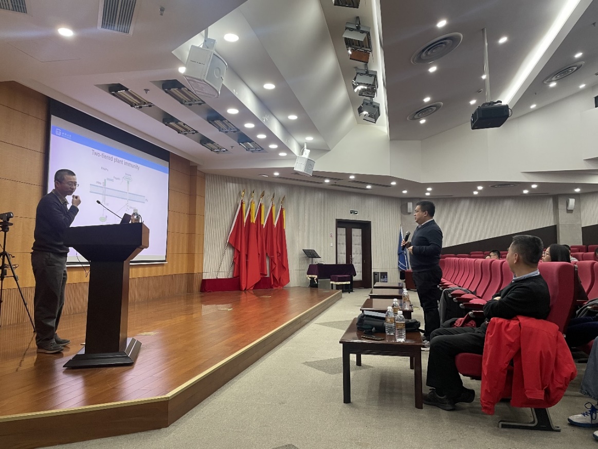 柴继杰作题为《植物免疫信号转导机制》的报告。他从植物中介导先天免疫反应的NOD样受体蛋白NLR讲起,详细介绍了植物NLR发挥功能的分子机制。同时,他还结合自身30余年的科研经历,分享了自己选择植物免疫作为研究方向的心路历程,鼓励同学们大胆做自己喜欢的研究。