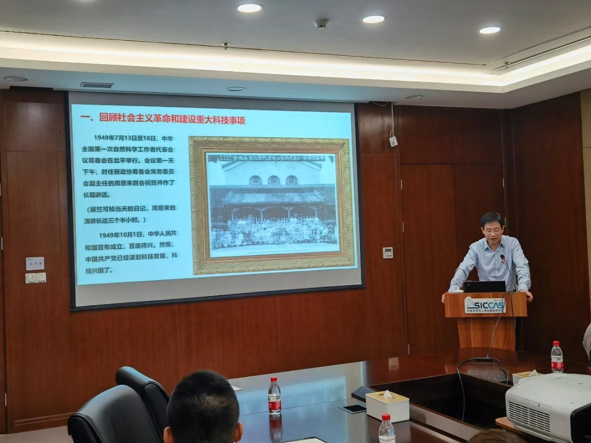 杨建华在报告中首先简要回顾了在社会主义革命和建设时期的重大历史事件,重点介绍了该时期我国科技事业所取得的巨大成就,详细阐述了 “两弹一星”、人工合成牛胰岛素、哥德巴赫猜想等一批重大科技成果。他谈到,同在这一时期建立起来的中国科学院,以国家重大需求为导向,以任务带学科,在推动新中国科技事业发展中发挥了重要作用,体现了国家战略科技力量应有的历史使命和责任担当。上海硅酸盐所也在此时实现独立建所,并在无机材料领域为满足国家经济和国防建设做出了重要贡献。他提出,现在我国科技发展领域正处于非常重要的历史阶段,新一轮科技革命和产业变革蓬勃兴起,全所科研工作者要牢牢树立 “国家队” “国家人”意识、担好“国家事” “国家责”,围绕研究所“十四五”科学发展规划,坚持需求和问题导向,为实现“四个率先”和“两加快一努力”目标要求而努力奋斗。