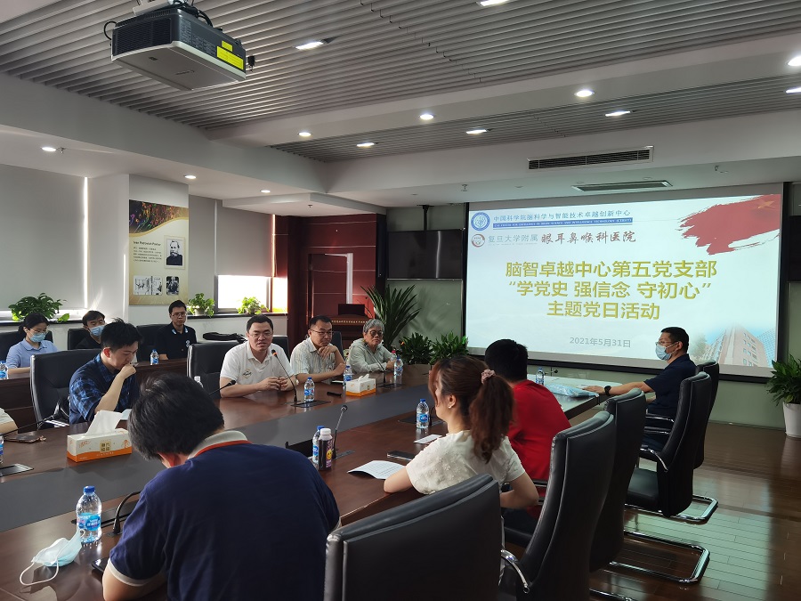 为庆祝中国共产党建党100周年,进一步提升党支部的组织力、凝聚力、战斗力,更好地发挥党员的先锋模范作用,2021年5月31日,脑智卓越中心第五党支部组织全体支部党员开展了“学党史 强信念 守初心”主题党日活动,开展党史学习教育,缅怀革命先辈,重温革命之路,不断坚定理想信念,坚守入党初心。活动由支部书记刘志勇研究员主持。