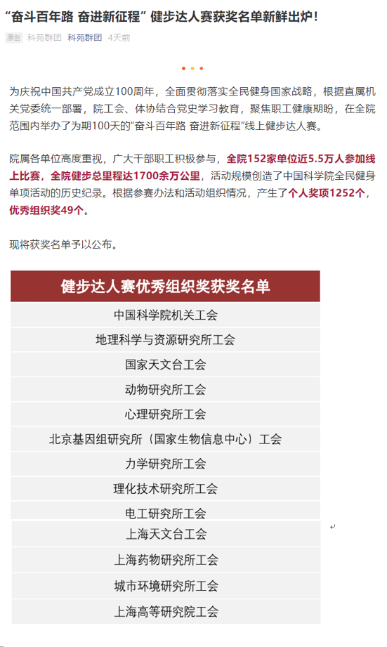本次活动得到了全台广大职工的大力支持和积极响应,有240多位同事上传了运动步数,累计步数近1000万步。有70人党史学习超过70分,其中有33人党史学习100分。我台工会还荣获中科院院“健步达人赛优秀组织奖”;江永琛、李立刚、虞林峰、许志强四位职工获中科院“健步达人赛优秀个人奖”。