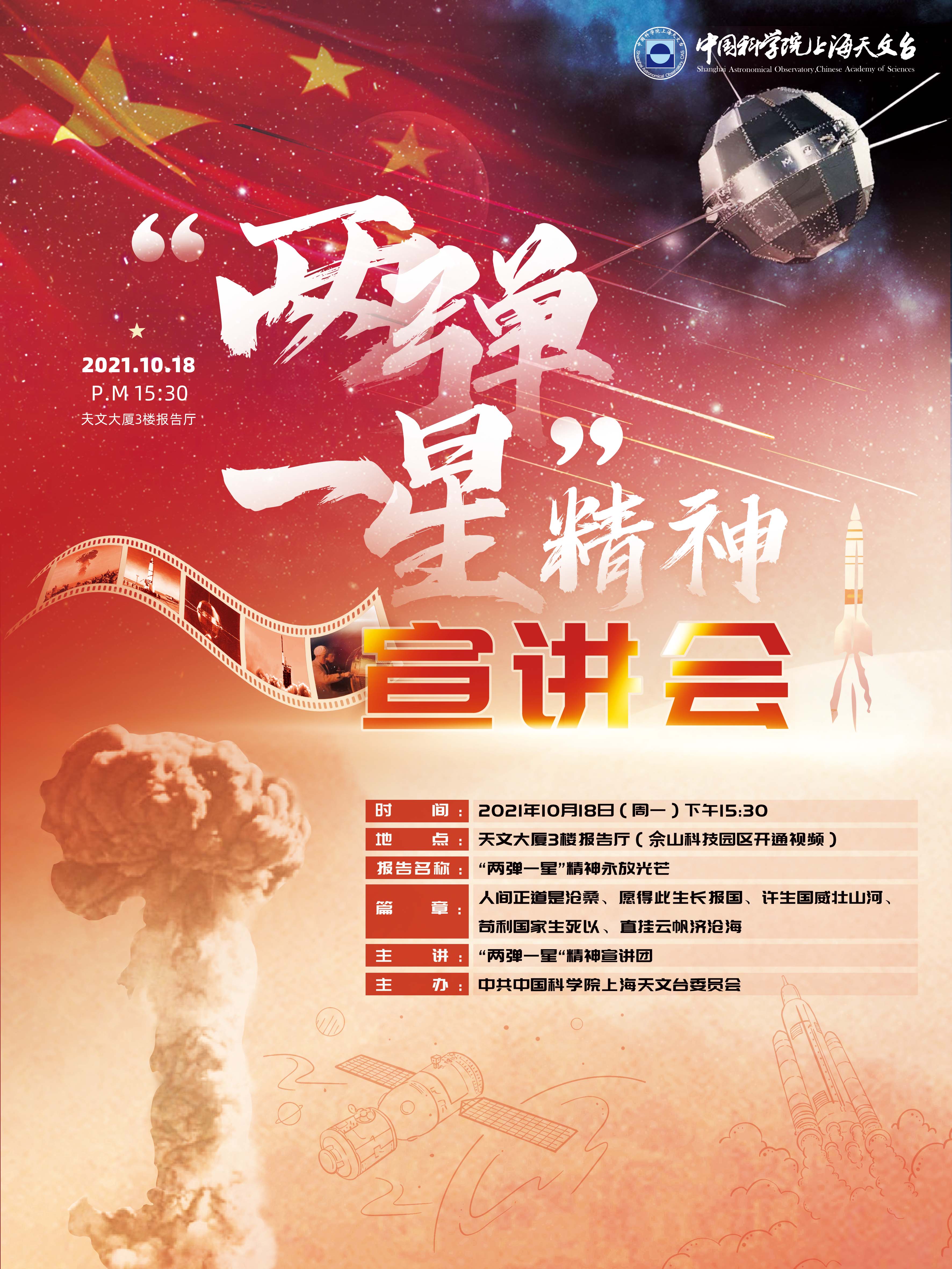 2021年10月18日,上海天文台举办“两弹一星”精神宣讲会,吸引了全台职工和研究生60余人踊跃观看学习。
