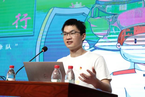 支援街道学生志愿者代表王光明介绍了先锋队在疫情最吃紧的时刻挺身而出,化身社区守护者,分派到街道所辖的十余个社区中,担任电话联络员、核酸检测员、物资发放员以及药品配送员等工作,回顾了守“沪”枫林,勇敢逆行的抗疫故事。
